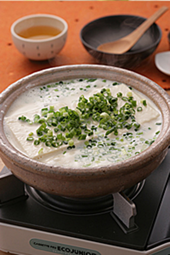 鍋中倒入豆漿,加入海鮮素和鹽。放進豆腐小火燉煮至熟。將豆腐弄碎勺起,與湯汁分離,再撒上蔥花,適量加點柚子胡椒即可享用。