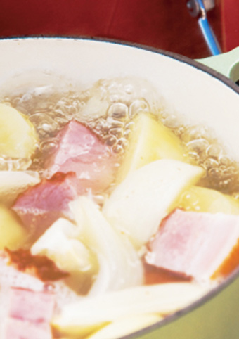 可用香腸和金槍魚代替臘肉,會有不一樣的風味哦。土豆吸收了清湯的香味,而洋蔥的甜味滲透每一個味蕾,請盡情享用吧。