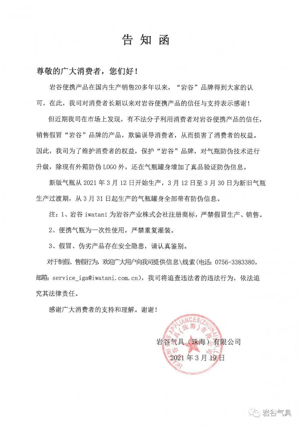 近期發現市場上銷售假冒“巖谷”品牌的產品,為了維護消費者的權益,保護“巖谷”品牌,對氣瓶防偽技術進行了升級,除現有外箱防偽LOGO外,還在氣瓶罐身追加了真品驗證防偽信息。 2021年3月12日至3月30日為氣瓶新舊版生產過渡期,3月31日起生產的氣瓶,罐身全部帶有防偽信息。